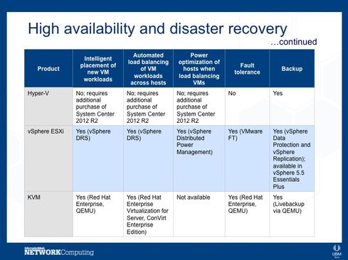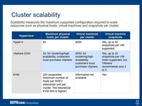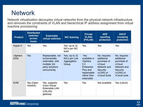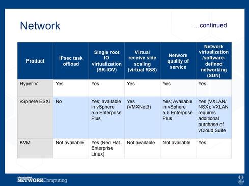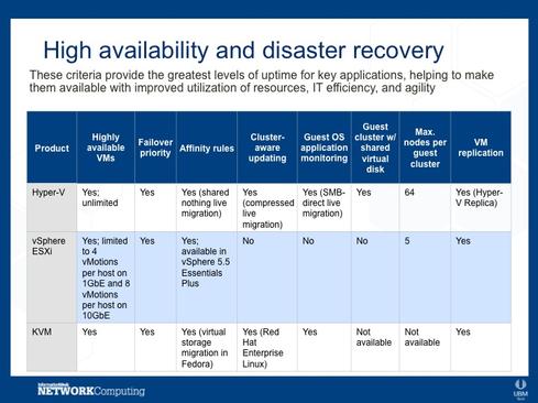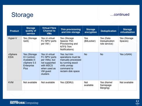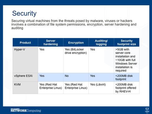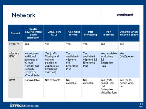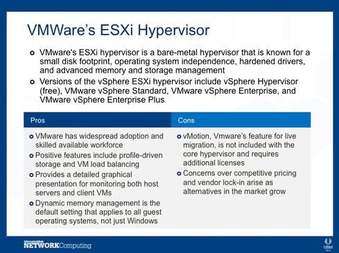 Our researchers compared the features of the top hypervisors in the market, which all happen to be Type 1: Microsoft's Hyper-V hypervisor, VMware's vSphere ESXi hypervisor, and KVM. Hyper-V and vSphere have the highest deployment rates, and KVM has several large backers and a great deal of support from the open source community.